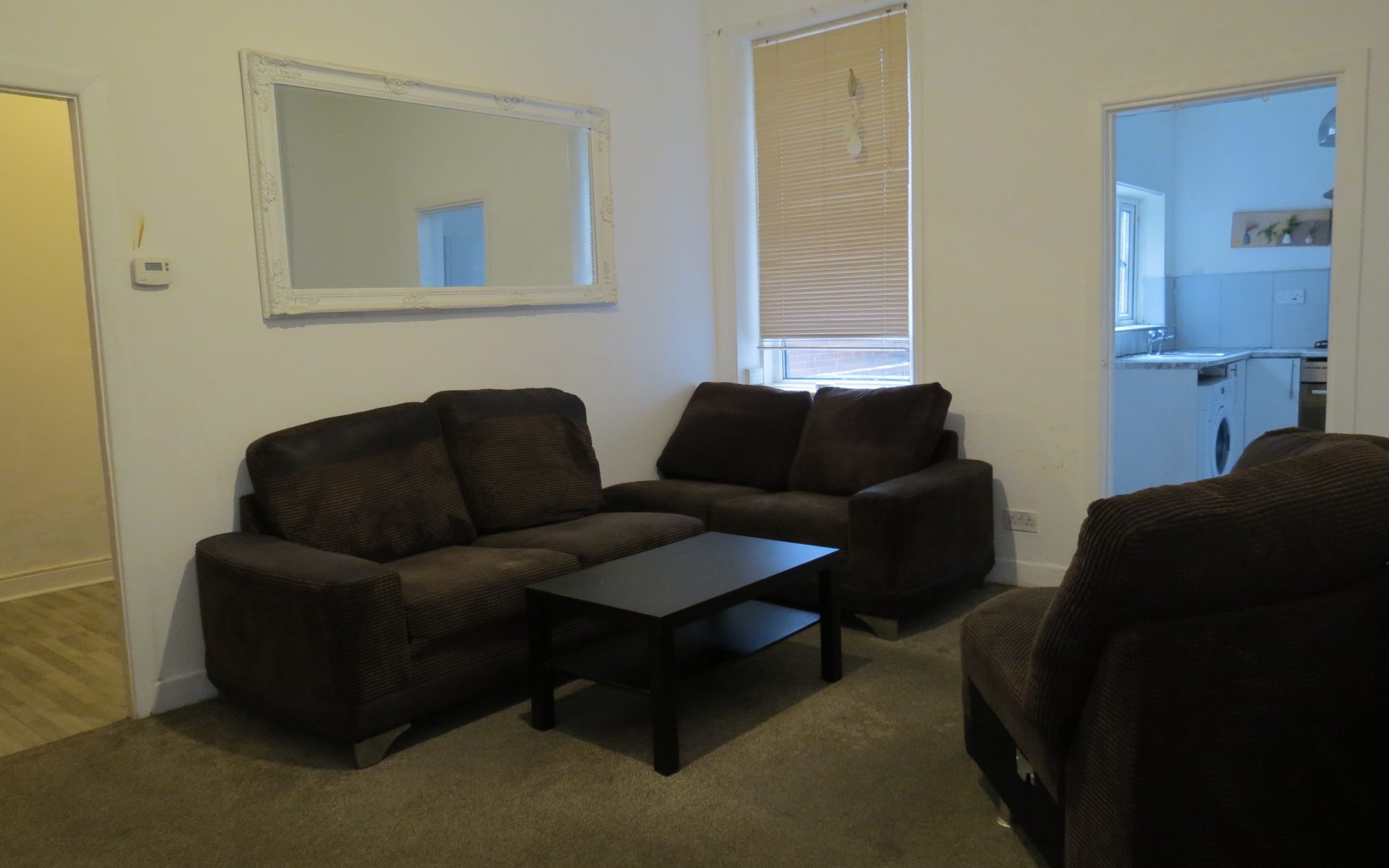 Spacious lounge area leading to kitchen.